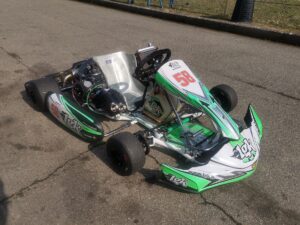 Telaio LGK Mustang 2018 con Motore Modena KK1 30Lt. sopra e sotto, pistone LIGHT nuovo; 2° carburatore VHSH30, carrello ribaltabile, radiatore NEW LINE con tendina, doppio set di cerchi in magnesio, pignoni Z15-Z16-Z17, corone Z24-Z25-Z26-Z27